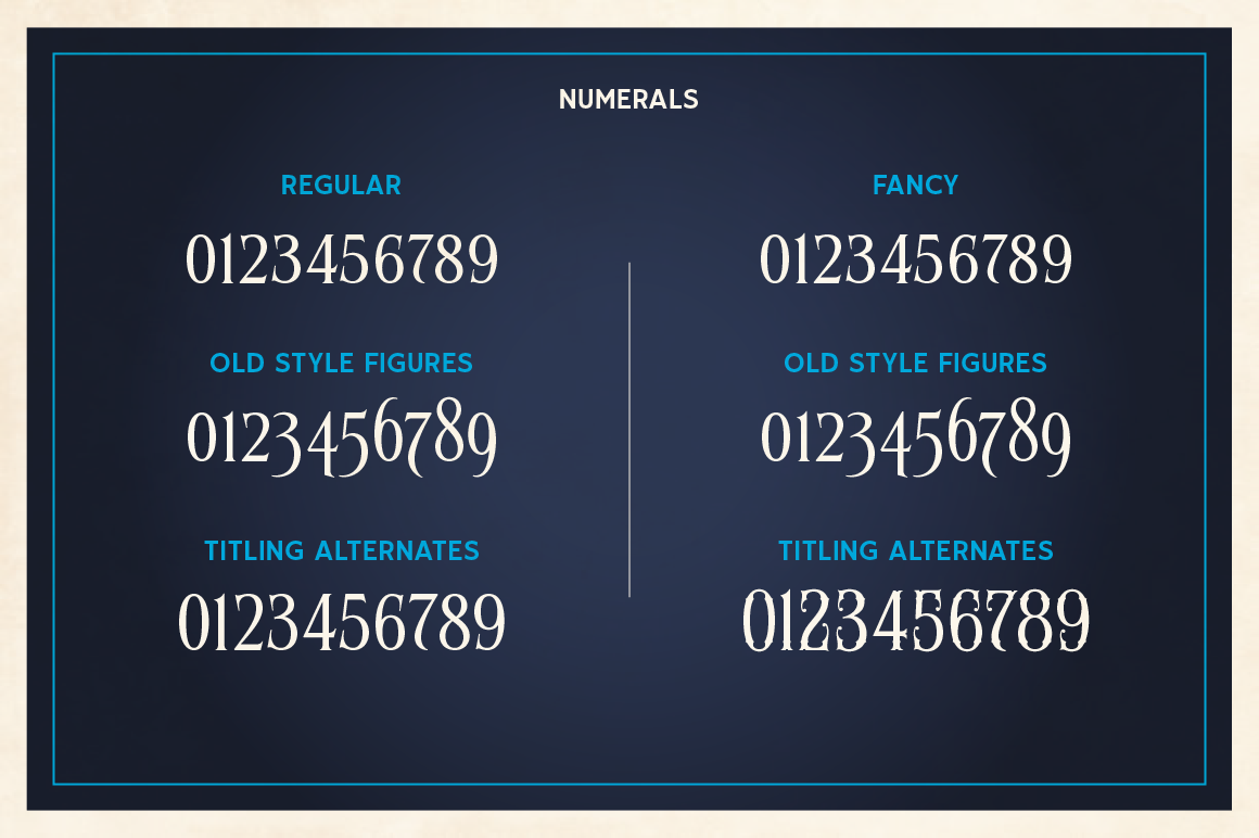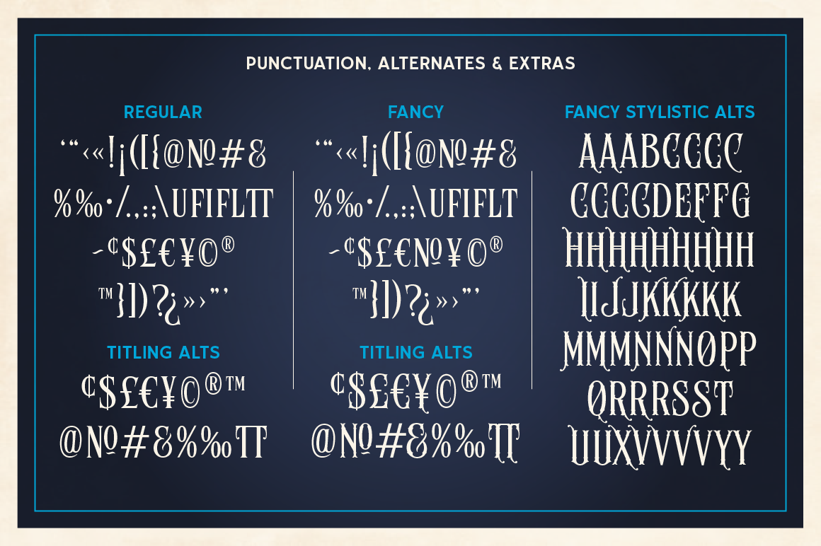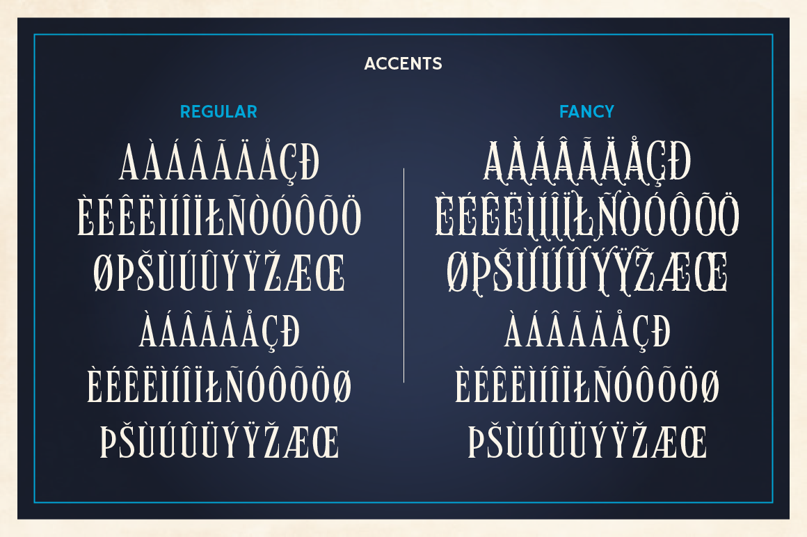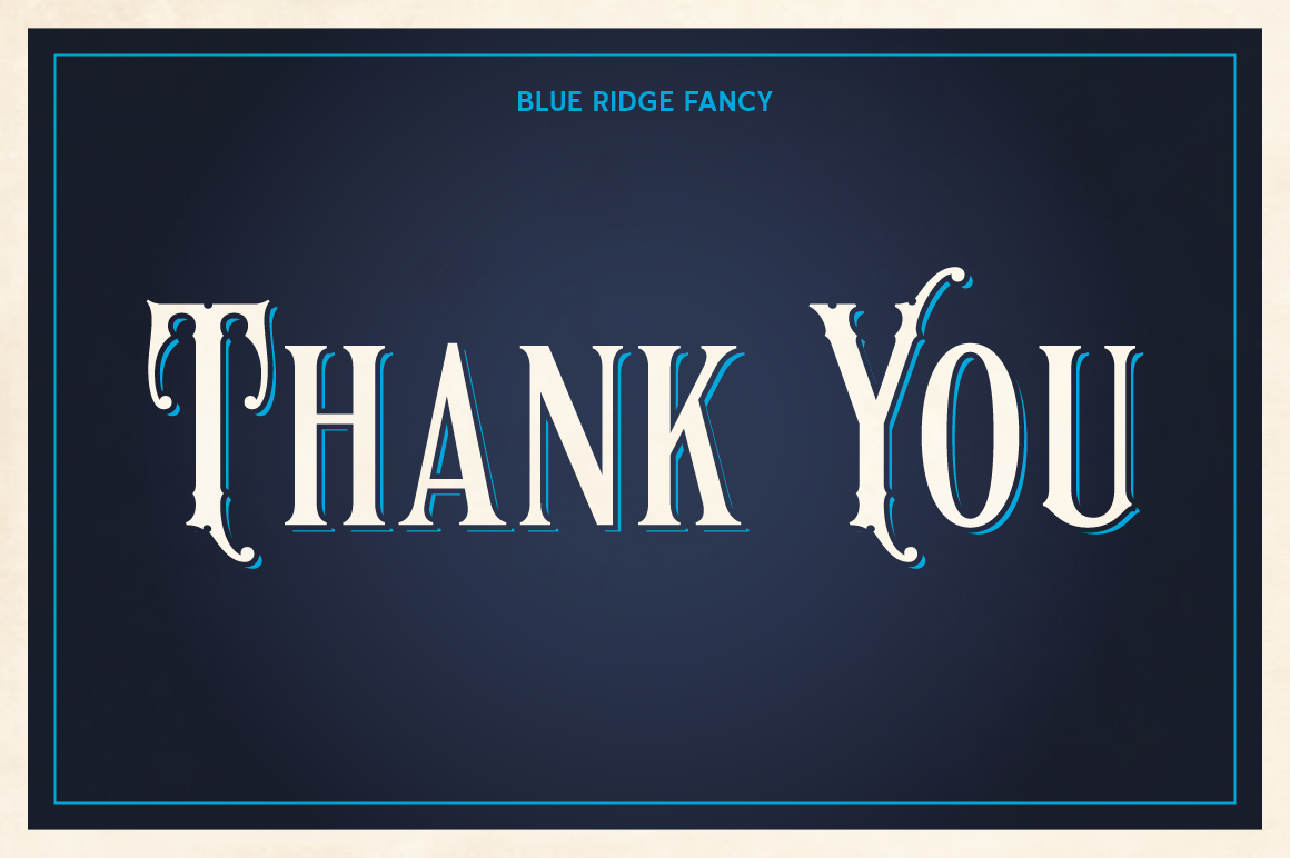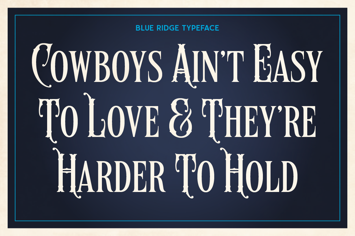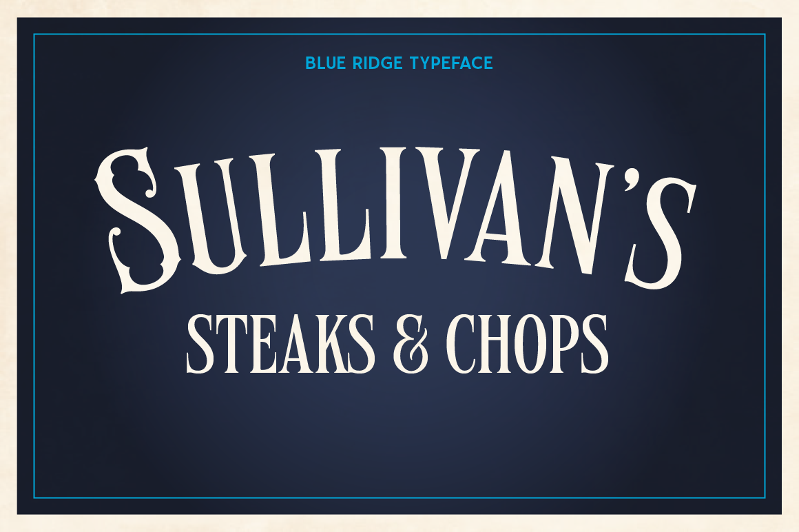 Blue Ridge is a vintage and modestly ornate display typeface that masterfully invokes the styling of cigar and liquor packaging labels from late 1800s America. It features a regular and fancy versions with decorative capitals, old style figures and titling figures. Use Blue Ridge to add instant style and glamour to your work.