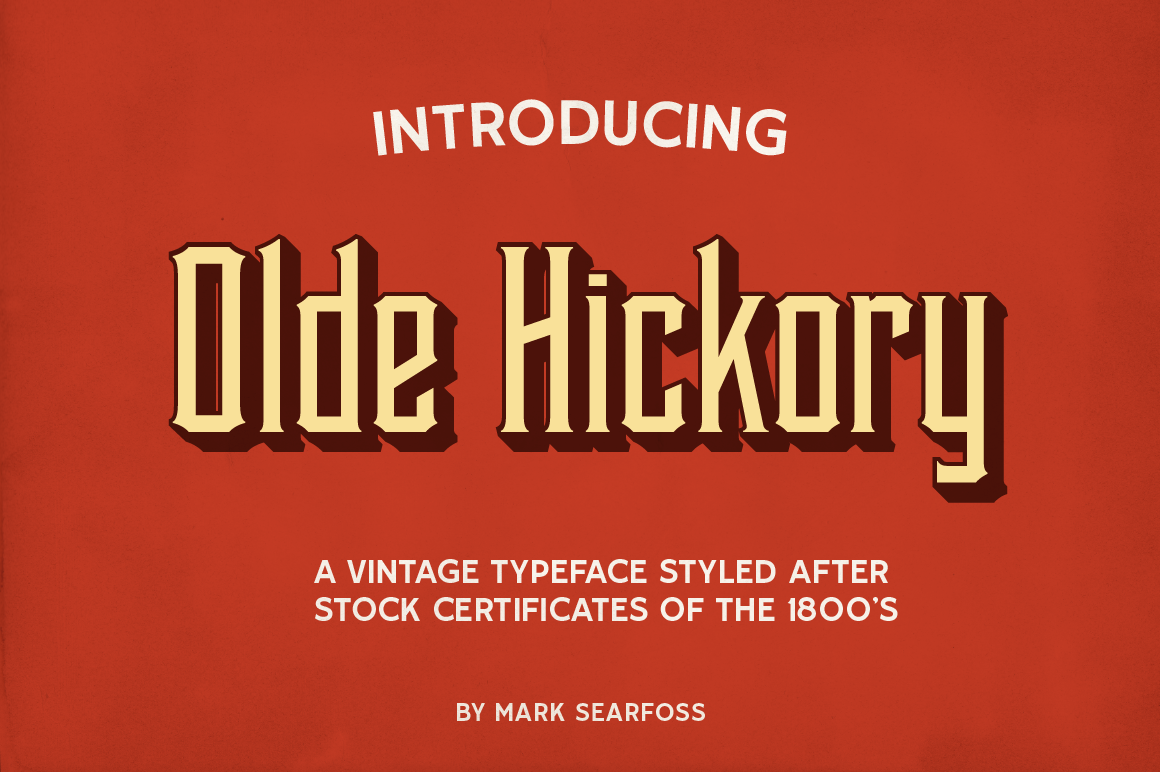 Olde Hickory is styled after stock certificates from the late 1800's andfeatures tall, thin letters with small serifs set at a slight angle for added personality. This set includes 4 fonts: Regular, Shadow, Spur and Spur Shadow. It is a must-have for a vintage stock certificate look. Available at letterheadfonts.com