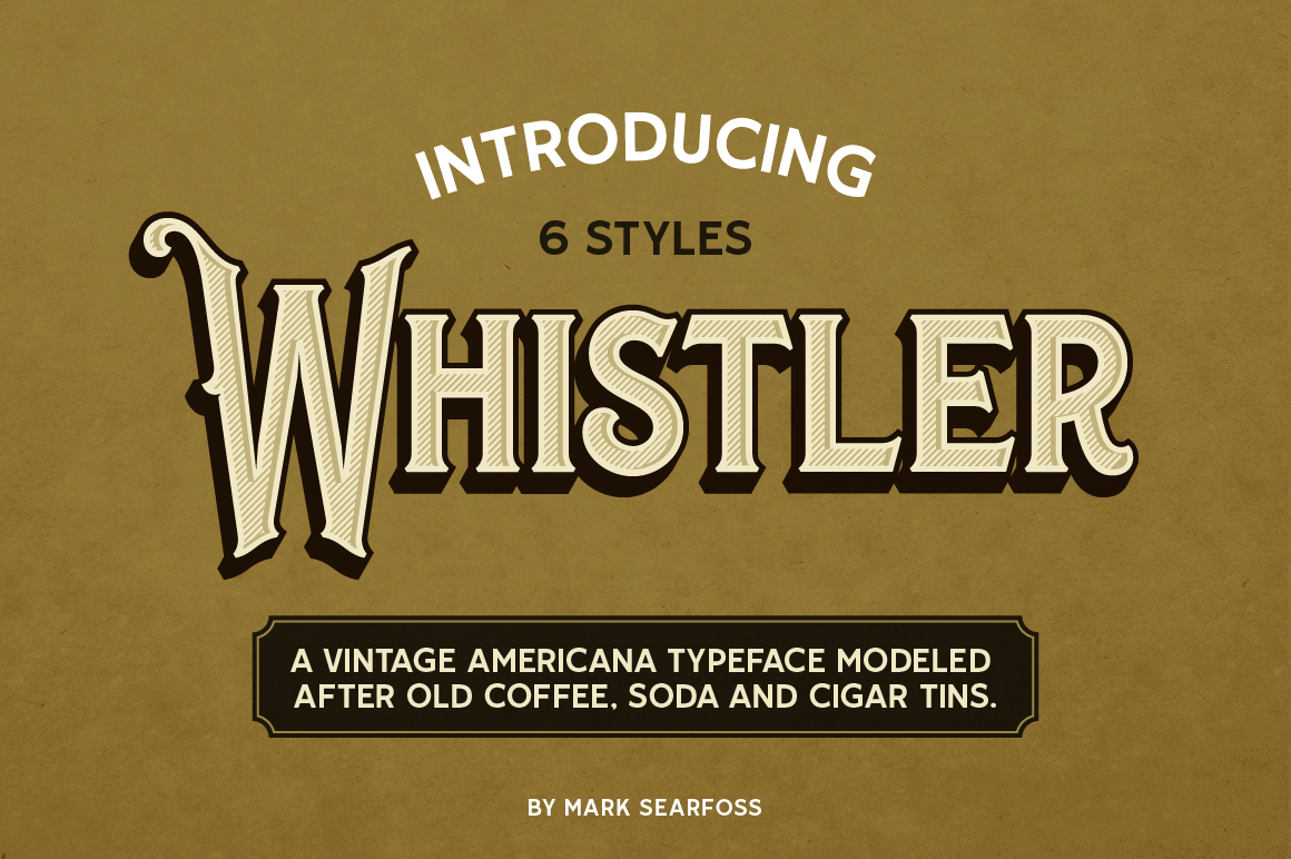 Modeled after old coffee, chewing gum, soda, and cigar box labels, Whistler's bold strokes and various insets invite you to experiment with its many creative possibilities. It features decorative caps and 4 different insets to complete your designs. The set includes 6 fonts: Regular, Shadow & 4 Insets. Get it today at letterheadfonts.com